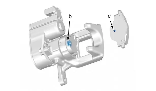 ATTENZIONE : Verificare che il dentino di posizionamento (in "c") della pastiglia si inserisca correttamente nella scanalatura (in "b") del pistone.