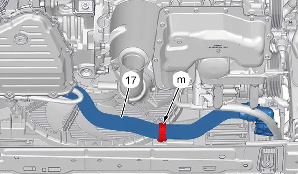 Disaccoppiare il tubo (17) del circuito di raffreddamento della catena di trazione ibrida (in "m").