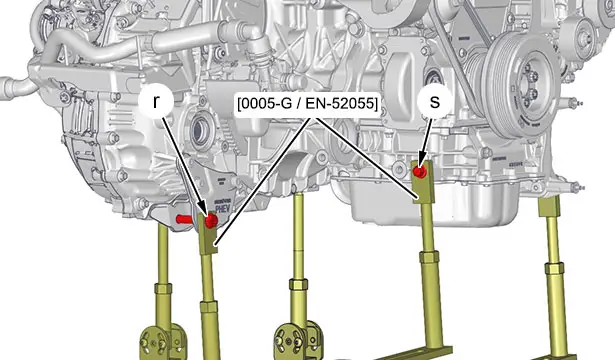 Posare l’insieme motore - cambio manuale pilotato a doppia frizione ibrida sulla piattaforma di sollevamento [0004-Z / WE-160002-A].
