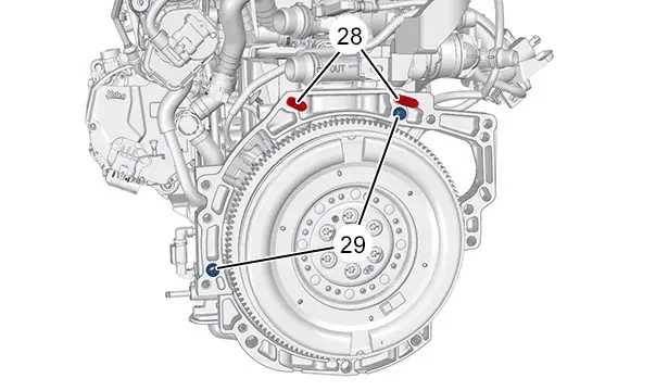 Avvicinare il cambio manuale pilotato con doppia frizione ibrida e posizionarlo in modo che sia davanti agli anelli di centraggio (29) e alle borchie di centraggio (28).