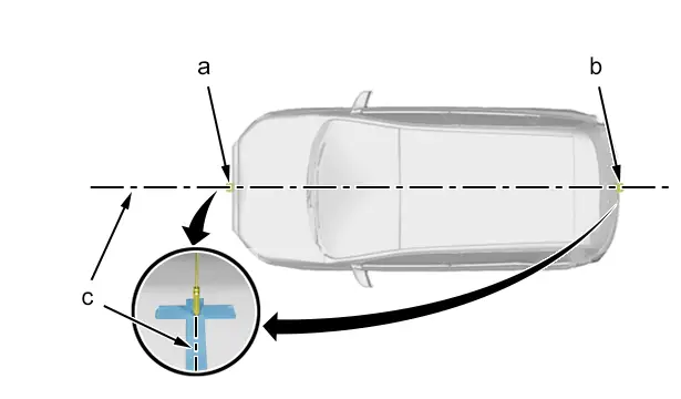 Contrassegnare l’asse longitudinale del veicolo a terra (In "c") ; Con una cordicella, facendola passare per i punti "a", "b".